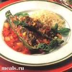 Оставшийся перец порезать кубиками, смешать с порезанными томатами и кипятить 10 минут. Затем приправить солью и молотым перцем. Фаршированный перц и томаты выложить на тарелки и украсить листиками базилика.