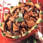 Для соуса: обжарьте бекон на подсолнечном масле в течение 1 минуты, добавьте чеснок, лук, морковь и сельдерей. Жарьте 5 минут, пока она не покоричневеет, помешивая, чтобы мука не пригорела. Снимите сотейник с огня и постепенно влейте бульон, красное вино и томатную пасту. Доведите смесь до кипения, непрерывно помешивая, затем кипятите в течение 10 минут. Процедите соус. Обваляйте кусочки говядины в муке и обжарьте на подсолнечном масле в большом сотейнике или жаропрочной кастрюле до коричневого отттенка. влейте соус в мясо и тщательно перемешайте. добавьте 2 лавровых листа, петрушку, соль и черный перец. доведите до кипения, переодически помешивая. Закройте посуду крышкой и тушите на медленном огне в течение 2 часов или запеките в духовке, пока мясо не станет нежным. Для крутов; срежьте корочки с хлеба и разрежьте каждый ломтик на 4 треугольника. Растопите масло на сковороде и обжарьте хлеб с обеих сторон до появления золотистого оттенка, следя, чтобы масло не пригорало. Снимите круты со сковороды и просушите. Окуните уголок каждого треугольника в растопленное масло, а затем в петрушку. выложите круты по краю тарелки и украсьте блюдо лавровым листом.