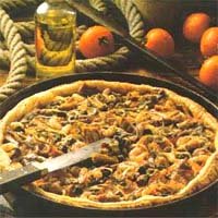 ПИЦЦА Пицца - это своеобразный пирог. В русском варианте представляет собой открытый пирог со всевозможными начинками или блин с припекою. Выпекают пиццу из дрожжевого, слоеного, пресного теста. Для начинок годятся ветчина, сосиски, сардельки, сваренные вкрутую яйца, сыр, грибы (чаще шампиньоны), помидоры, сладкий болгарский перец, речатый лук, лук-порей, молодые кабачки диаметром не более 2 см, такие же баклажаны, стручки молодой зеленой фасоли, свежая морковь, нарезанная узкими длинными (3-4 см) брусочками, маслины, оливки, майонез, томат-паста, зелень укропа, петрушки, сельдерея. Важным достоинством пиццы является то, что на ее изготовление не требуется больших затрат труда и времени. Это, можно сказать, экспресс-блюдо. При этом пиццу охотно едят и взрослые, и дети. Ее подают и к завтраку, и к обеду, и к ужину, к кофе или чаю. Как и пирог, пиццу удобно взять в дорогу, в лес, на рыбалку.